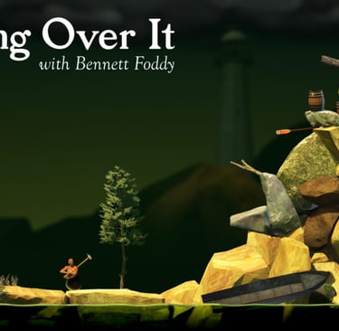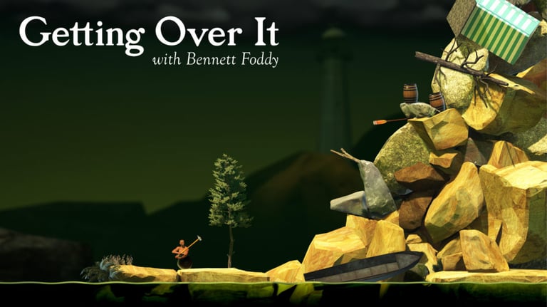 getting over it with bennett foddy, kasıtlı olarak zorlaştırılmış kontrolleri ve acımasız cezalandırma sistemiyle oyun dünyasında bir fenomen haline gelmiş, "frustration (hayal kırıklığı) simülasyonu" türünün en saf örneğidir. oyunun tek bir kontrol mekaniği vardır: farenizle (veya trackpad) balyozu hareket ettirmek. karakterinizi yürütmek veya zıplatmak için bir tuş yok; sadece balyozu zemine veya nesnelere çarptırarak kendinizi itmeli, çekmeli veya asılı kalmalısınız. bu mekanik, ilk başta imkansız gibi görünse de zamanla balyozun ağırlığını ve momentumunu hissetmeye başladığınızda tuhaf bir ustalık gerektirir. ancak bu ustalık bile sizi en küçük bir hata sonucu dakikalarca (hatta saatlerce) tırmandığınız yolu saniyeler içinde geri düşmekten kurtaramaz.